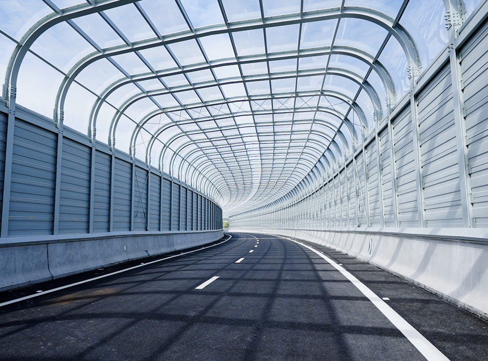 该项目位于广东省珠海市横琴大道与环岛西路交汇处,声屏障总长223m,设计面积约4000㎡。该项目为全封闭声屏障结构,侧面采用全金属板,顶部为外敷式透明PC板,跨距10m,是较为典型的公路桥梁全封闭声屏障结构样式。